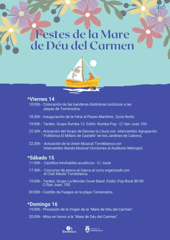El Ayuntamiento de Torreblanca ha elaborado una atractiva programación que combina tradiciones y ocio para celebrar las Festes de la Mare de Déu del Carmen, que se celebrarán entre este viernes 14 de julio y el domingo 16. Habrá más de una decena de actividades a lo largo del fin de semana, que culminarán el domingo con la procesión y la misa en honor de la Virgen de la Mare de Déu del Carmen.
