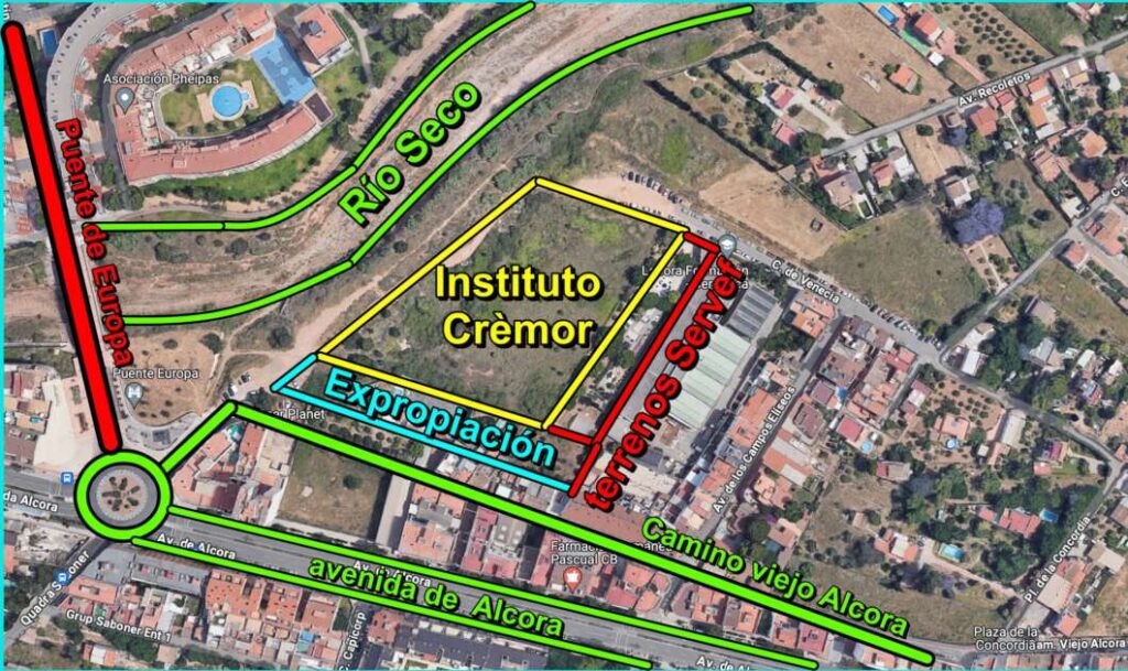 1.- Ampliar el Suelo Dotacional de Crèmor en la ubicación prevista. En este caso, el Instituto se queda donde ya estaba planificado, y en su caso, se obtendrían los 4.000 metros cuadrados necesarios para los Ciclos Formativos Agrarios “a costa de la parcela que ocupa el Servef, quqe también es de titularidad de la Generalitat Valenciana y cuyas instalaciones están actualmente empleándose para completar ciclos formativos de formación profesional del IESs Caminás de la población”.