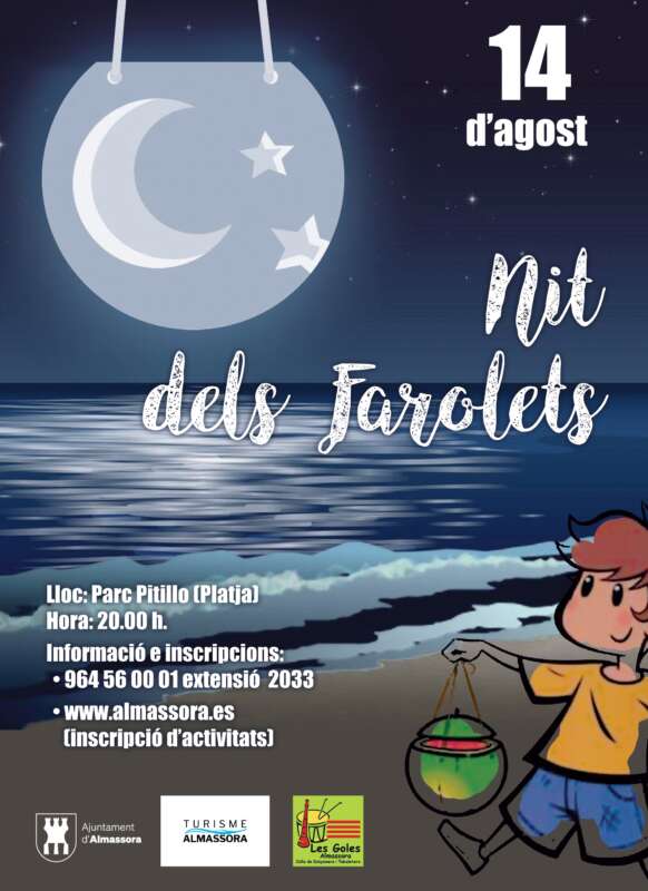 L'Ajuntament d'Almassora ha organitzat per a este pont d'agost activitats gratuïtes que conjuminen la cultura, la tradició i, per descomptat, l'entreteniment. La primera d'estes propostes, que és la primera vegada que se celebra dins de la programació estiuenca és la Nit dels Farolets, que tindrà lloc este dijous, 14 d'agost, al parc del Pitillo, davant de la biblioteca, a partir de les 20.00 hores.