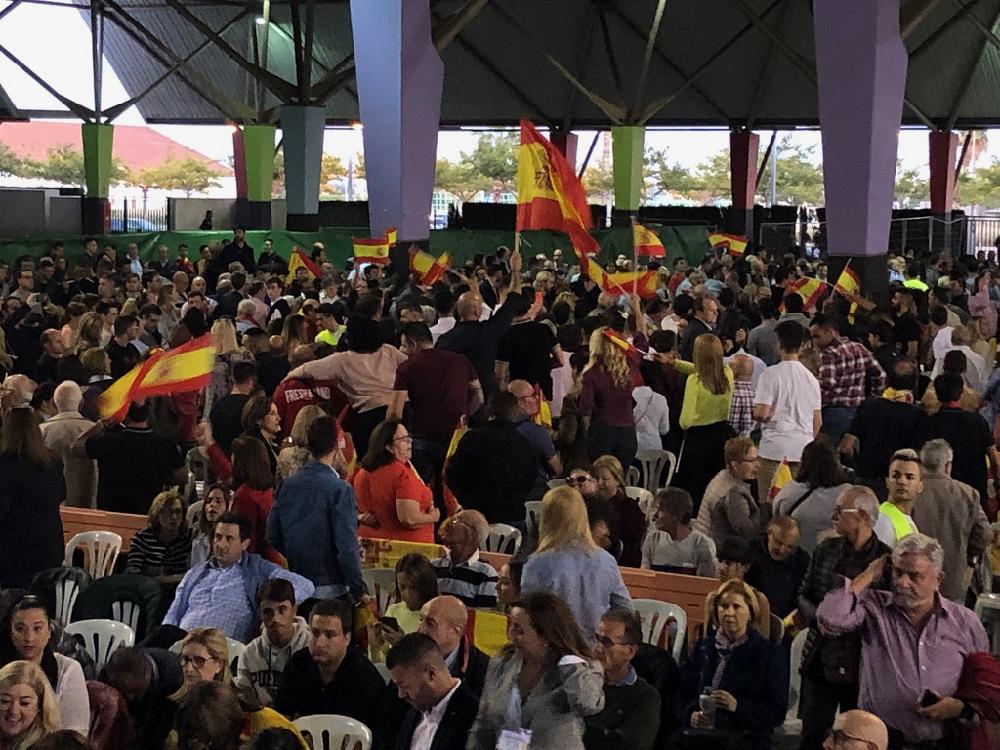 Aparte de los discursos políticos de esta pre campaña electoral, lo más destacado del mitin convocado en torno al líder de Vox, Santiago Abascal, fue la capacidad de concentración, la música que entonó a los asistentes para motivarlos para el acto, y las largas colas y centenares de banderas españolas.