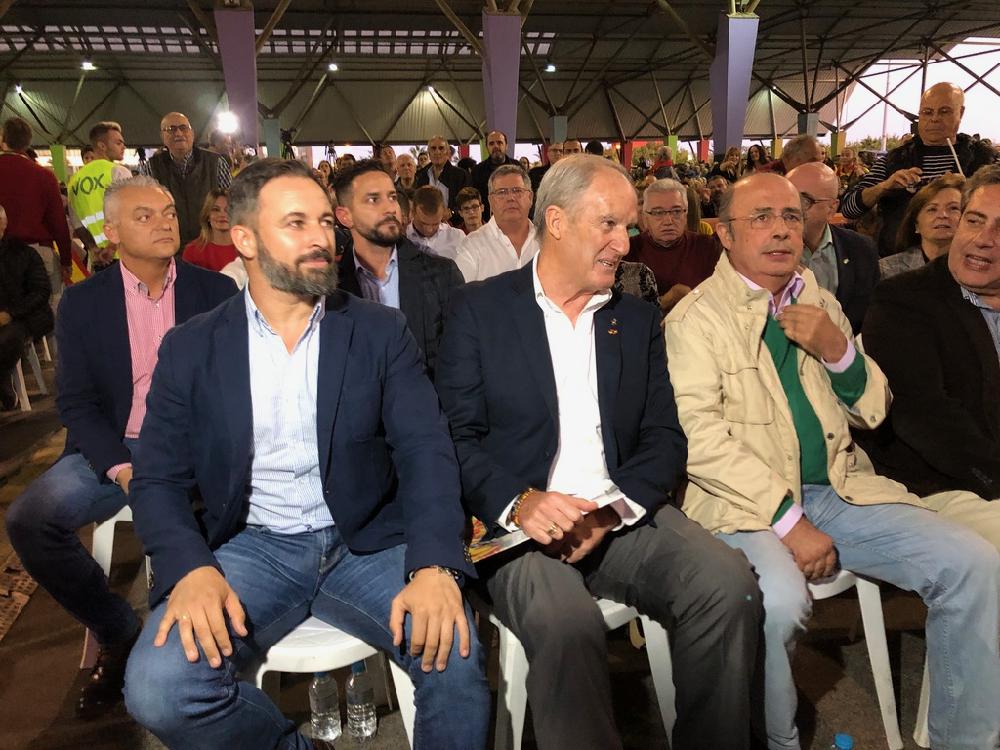 Diez minutos después comenzó el movimiento y comenzaron a bandearse las banderas españolas al tiempo que los asistentes intentaban grabar a su líder, Santiago Abascal, que ya se diría al escenario acompañado por Alberto Asarta, candidato de Vox al Congreso por Castellón y por la presidenta de Vox en la provincia, Llanos Masó.