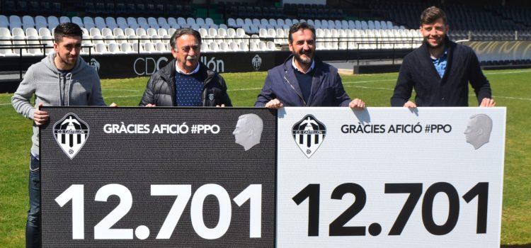 Los propietarios de la entidad, Pablo Hernández, Ángel Dealbert, Alfonso Hernández y Vicente Montesinos, han posado con dos cartones pluma –uno en blanco y otro en negro- bajo el lema “Gràcies afició” y con el número 12.701, con el fondo de los nombres de los aficionados que esta temporada han obtenido su abono del conjunto orellut.