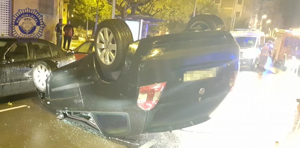 Varios vecinos que han escuchado la fuerte colisión, han avisado rápidamente al Centro Integral Municipal de Seguridad y Emergencias 092 del accidente de tráfico al tiempo que han asegurado que el conductor del vehículo causante parecía estar herido. Hasta el lugar se han acercado inmediatamente una patrulla del Grupo de Intervención de Proximidad, G.I.P. y la patrulla de Atestados de la Policía Local, los cuales han localizado rápidamente el siniestro y al conductor del turismo accidentado, quien tenía problemas para salir del vehículo volcado y presentaba un golpe en una rodilla. Los agentes, tras auxiliarle y solicitarle su documentación, han observado que éste se encontraba con síntomas de estar bajo los efectos del alcohol por lo que le han realizado la prueba de alcoholemia. El conductor, F.E.L.S, de 21 años de edad, ha triplicado la tasa permitida, por lo que la Policía Local de Castellón le investiga por un presunto delito contra la Seguridad Vial por conducir bajo los efectos del alcohol. Mientras se realizaba la prueba de alcoholemia, el conductor ha sido atendido por una ambulancia en el lugar del accidente y tras esta asistencia sanitaria, ha sido trasladado hasta el Hospital General con pronóstico leve por la contusión en la rodilla.