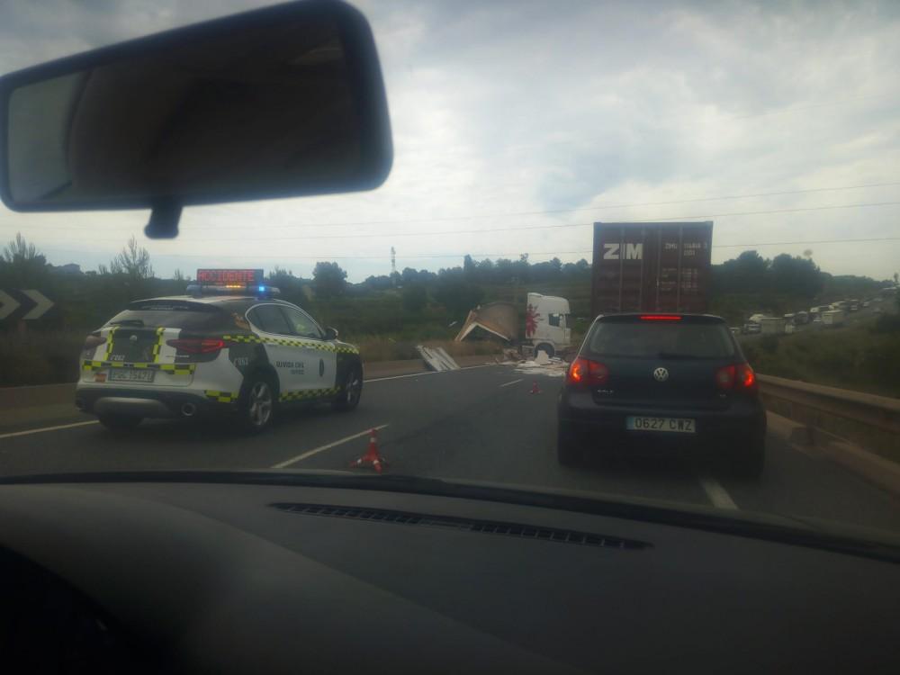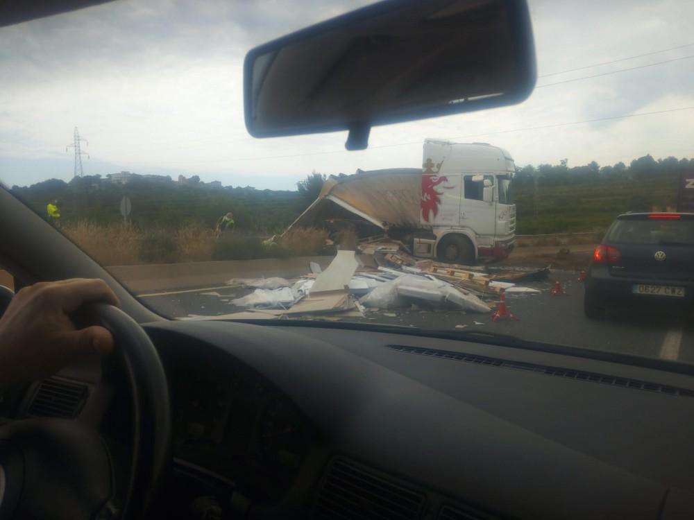 El accidente de tráfico de un camión en la CV-16, carretera de Alcora, en dirección a l'Alcora, ha producido serios problemas en las comunicaciones de este vial, en la zona próxima a la urbanización de Benadresa.