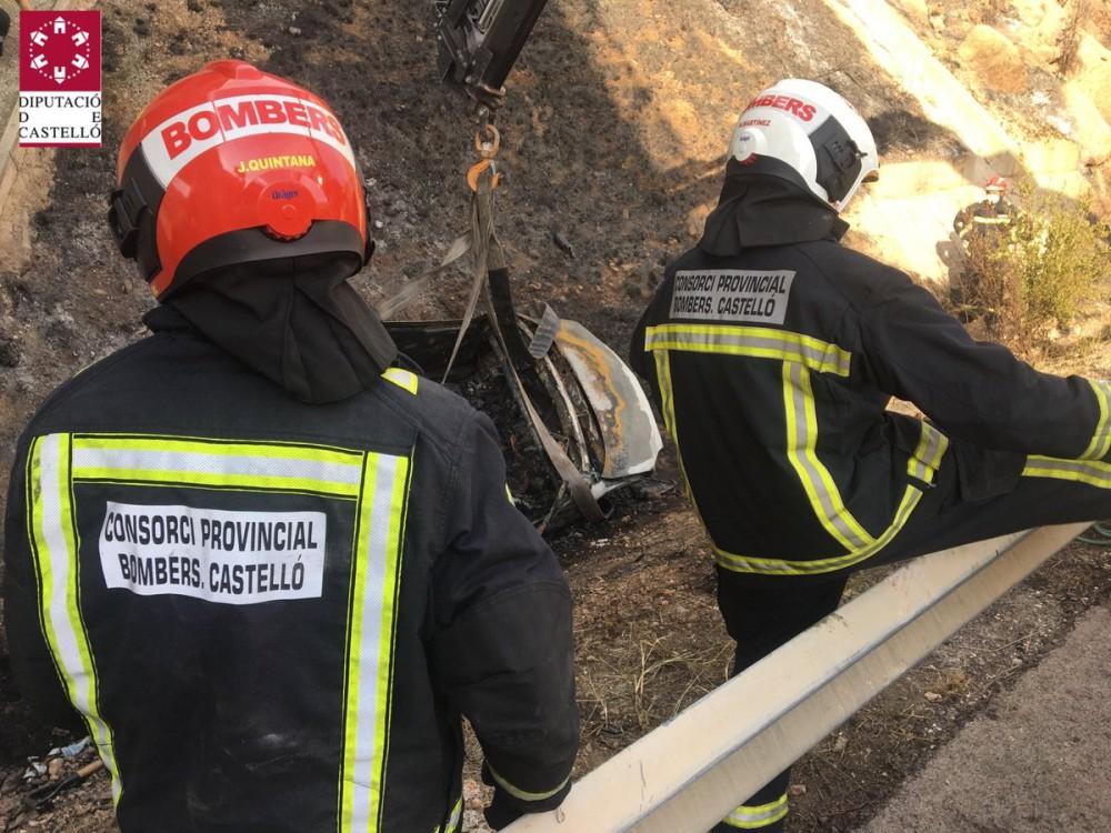 El Consorcio Provincial de Bomberos de Castellón ha movilizado a los Bomberos del Parque de Plana Alta. A su llegada han confirmado que en el interior del vehículo había personas atrapadas. Los efectivos del Consorcio han procedido a la extinción del incendio, y posteriormente han podido confirmar que en el interior del vehículo había dos personas fallecidas. Tras la autorización de la Guardia Civil, se ha procedido a excarcelar a las víctimas, confirmándose también la existencia de un perro fallecido.