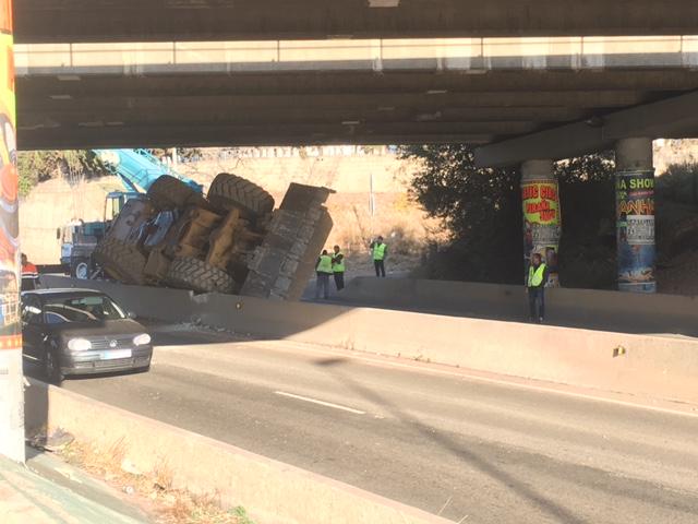 Al parecer el vehículo industrial estaba siendo transportado por un camión habilitado para tal efecto pero al pasar por debajo del puente, la altura de gálibo no era la suficiente con lo que el techo del vehículo industrial ha colisionado con la parte baja del puente volcando en el mismo instante hacia el sentido opuesto del vial.