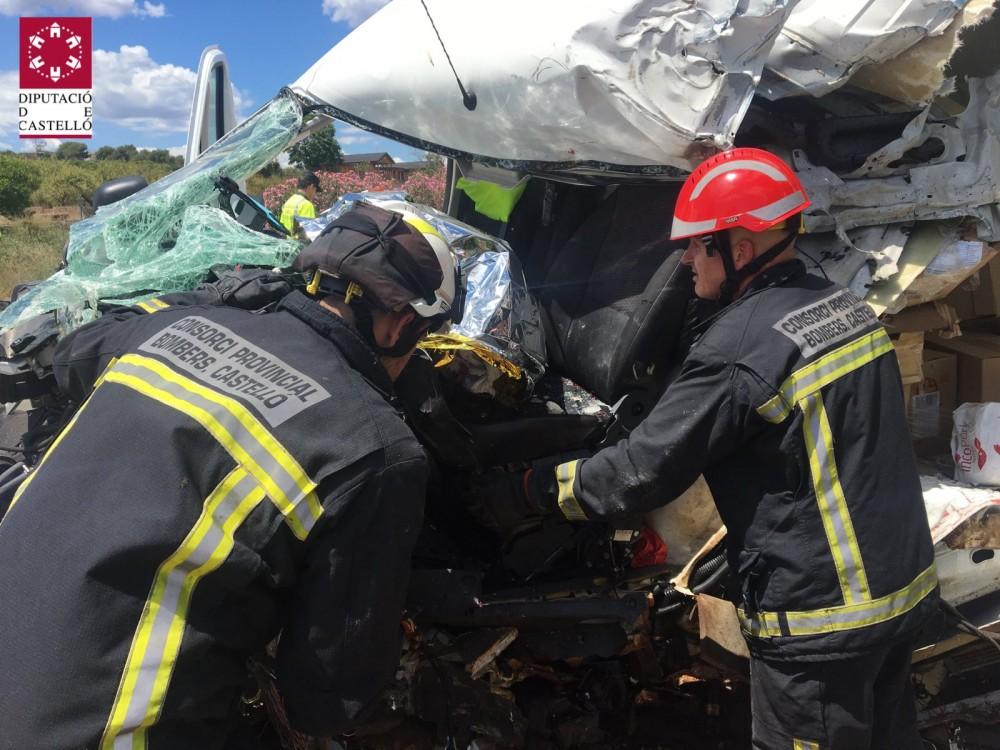 El aviso se ha recibidoa las 11.55 horas y en él se alertaba de una colisión entre un camión y una furgoneta, quedando el conductor de ésta atrapado en el interior del vehículo debido al fuerte impacto. Hasta el lugar se han desplazado dos dotaciones de Bomberos del Parque de Plana Baixa, perteneciente al Consorcio Provincial.