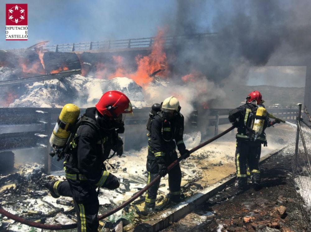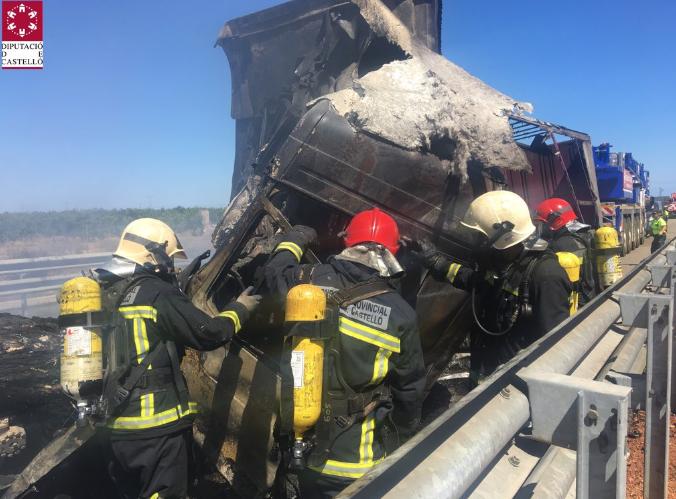 Accidente camiones Nules 250717 3Los bomberos realizaron una primera intervención de urgencia en esa zona del incendio, para acceder lo más rápidamente posible hasta el conductor atrapado. cuando lo consiguieron, los agentes de la Samu confirmaron que la persona ya había fallecido.