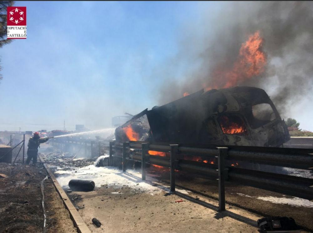 Un conductor fallece y otro resulta herido en un choque de camiones, que se incendiaron, en la A-7 en Nules