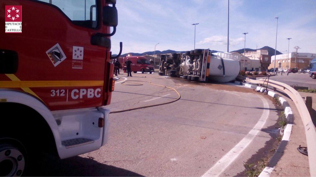 Al llegar al lugar de los hechos los efectivos del Parque de Bomberos Espadà Millars han encontrado un camión cisterna volcado en una rotonda de la vía.