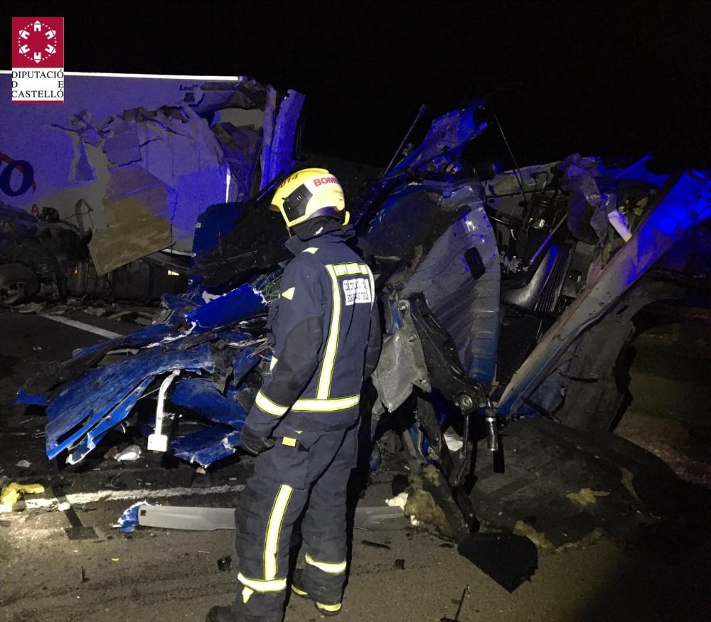 Aparatoso accidente de tráfico entre dos camiones articulados en la autopista AP-7 a la altura de Benicàssim, tal y como ha informado el servicio de información del Consorcio Provincial de Bomberos.