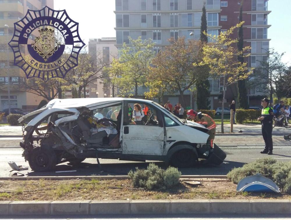 La Policía Local de Castellón junto con un retén de bomberos municipales y una ambulancia han intervenido esta tarde en un aparatoso accidente de tráfico producido por una salida de vía de un turismo que ha colisionado lateralmente contra un semáforo que regula un paso de peatones de la ronda de circunvalación. El siniestro se ha producido sobre las 17:20 cuando por circunstancias que está investigando la Unidad de Atestados de la Policía Local de Castellón, un turismo de color blanco que circulaba por la Ronda Norte sentido centro ciudad se ha salido de la vía unos metros antes de llegar al paso de peatones regulado por semáforo y tras golpear la mediana de la ronda de circunvalación, finalmente ha colisionado lateralmente contra el semáforo. Debido al impacto, el turismo ha girado sobre sí mismo y se ha quedado parado en sentido contrario sobre la calzada de la Ronda Norte.