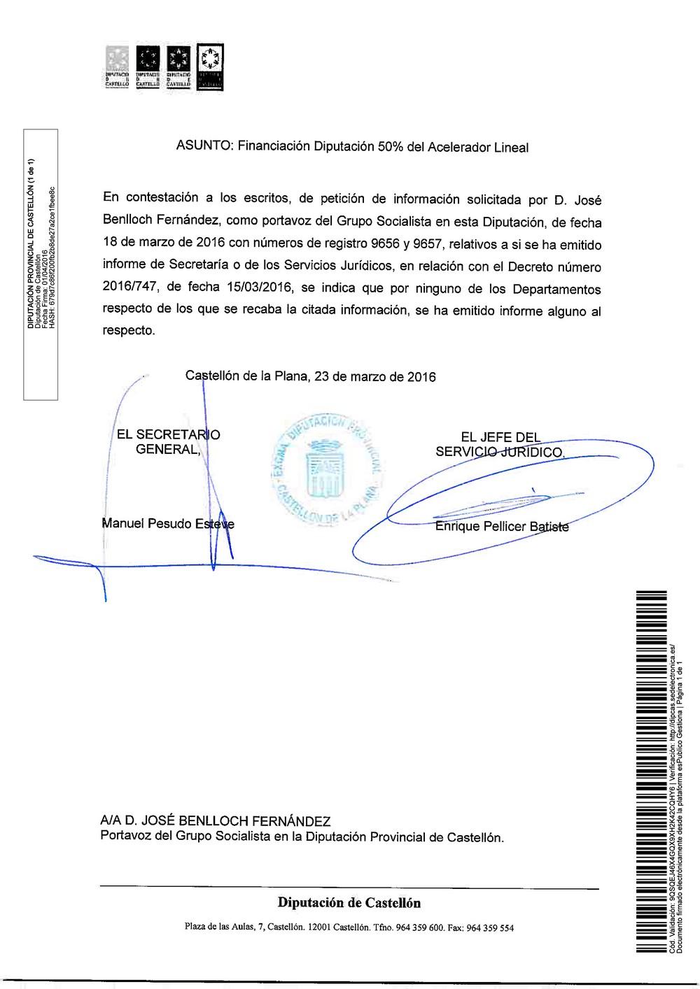Para resolver las dudas, el Grupo Socialista en Diputación solicitó un informe al Servicio de Intervención de la Diputación, pero también al secretario de esta entidad. No se trataba sino de salir de dudas, de que los expertos se pronunciaran si la Diputación ha cumplido o no con su parte, pero además, si ese dinero debe y puede utilizarse como transferencia de gastos corrientes, o parte del mismo se puede derivar a la adquisición del acelerador, como inversión.