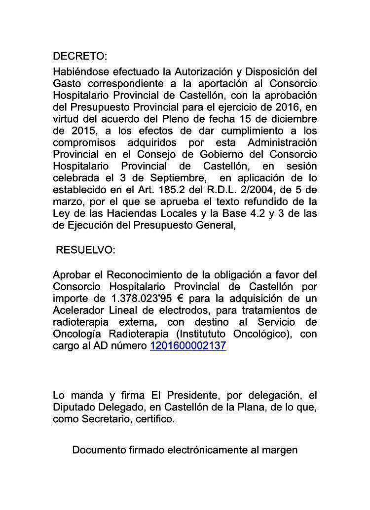 Tras el compromiso adquirido por el presidente de la Diputación y la consellera de Sanidad, el pleno de Diputación aprobaba por unanimidad, la aportación de una cantidad de 1,5 millones de euros para hacer frente a la mitad del coste de la compra del acelerador. En aquel momento ya se apuntó, que la Diputación realizaría su aportación, con un incremento de la cantidad citada en la trasferencia anual de fondos, que Diputación compromete con el Consorcio.