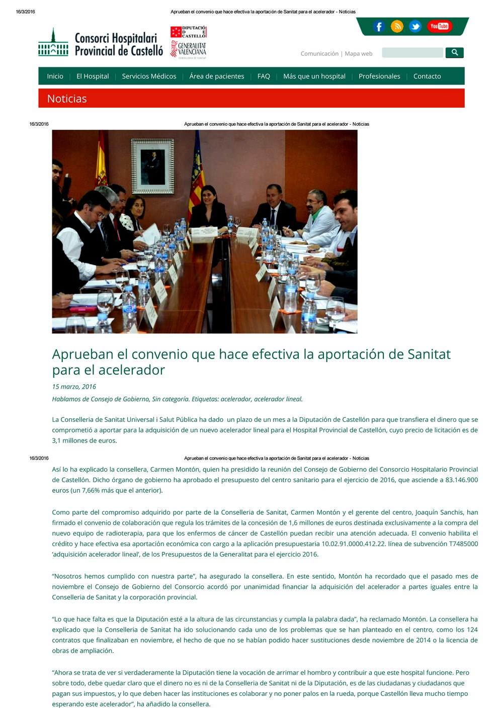 Tras esta situación, el presidente de la Diputación Provincial se comprometió con la consellera de Sanidad, a poner por su parte la mitad del coste de esta maquinaria, para desbloquear el proyecto. La noticia, en sus dos versiones, comunicado de Diputación (La Diputación de Castellón pagará una parte importante del acelerador del Hospital Provincial) y comunicado de Conselleria (La Conselleria de Sanidad desbloquea la compra del nuevo acelerador del Hospital Provincial de Castellón), también se publicó en este periódico con fecha de 3 de septiembre