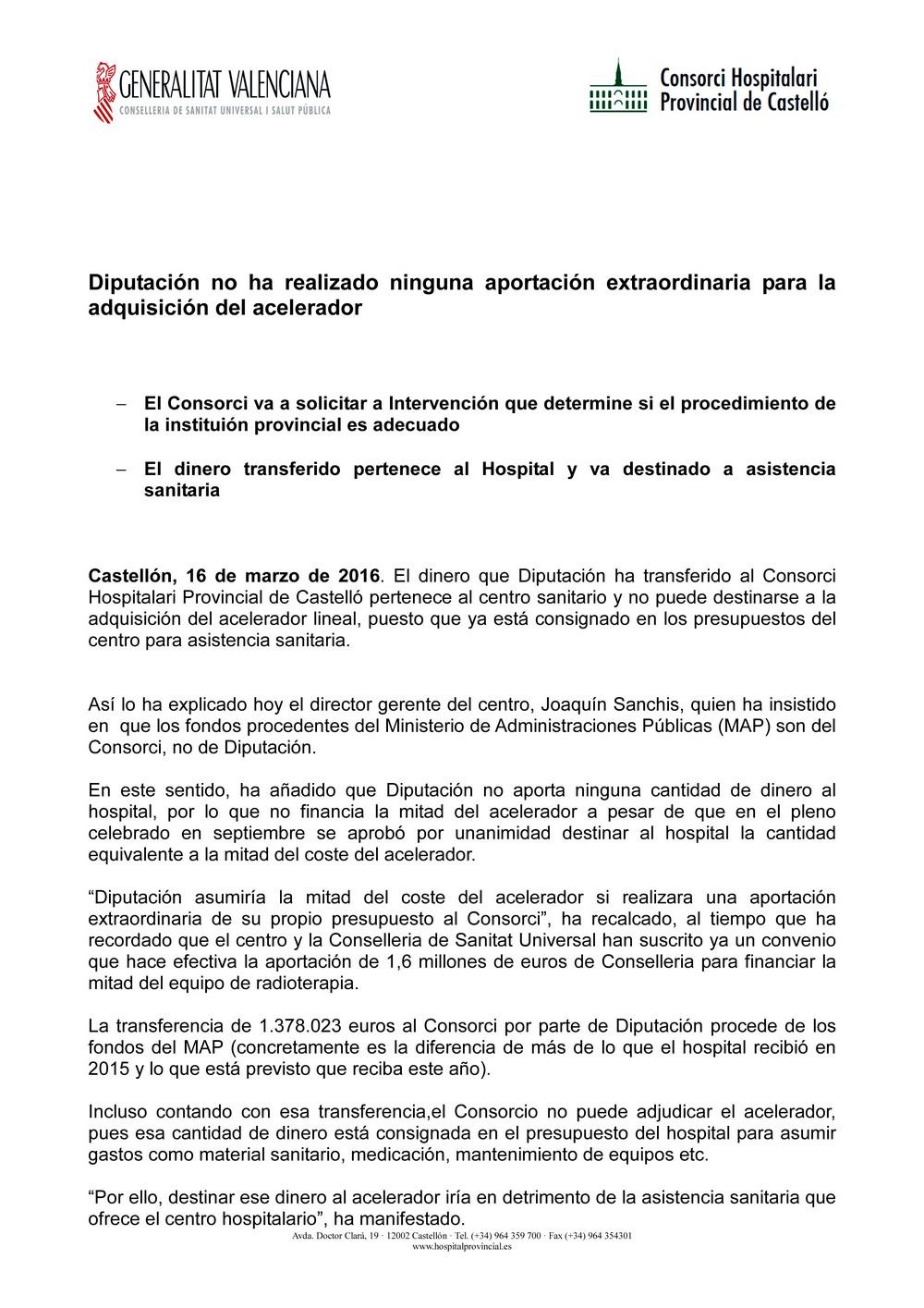 "De ese modo, la Diputación ha aumentado en 1,5 millones la transferencia que realiza al Hospital Provincial, suponiendo las aportaciones a realizar hasta finales de año un ingreso conjunto de 3.369.059,65 euros. Cabe señalar que con esta transferencia se da un paso fundamental para agilizar la compra del acelerador, dando por finalizado la Diputación el proceso de financiación que ya inició el 8 de abril redactando los pliegos y remitiéndoselos a la Conselleria de Sanidad el pasado 20 de mayo."