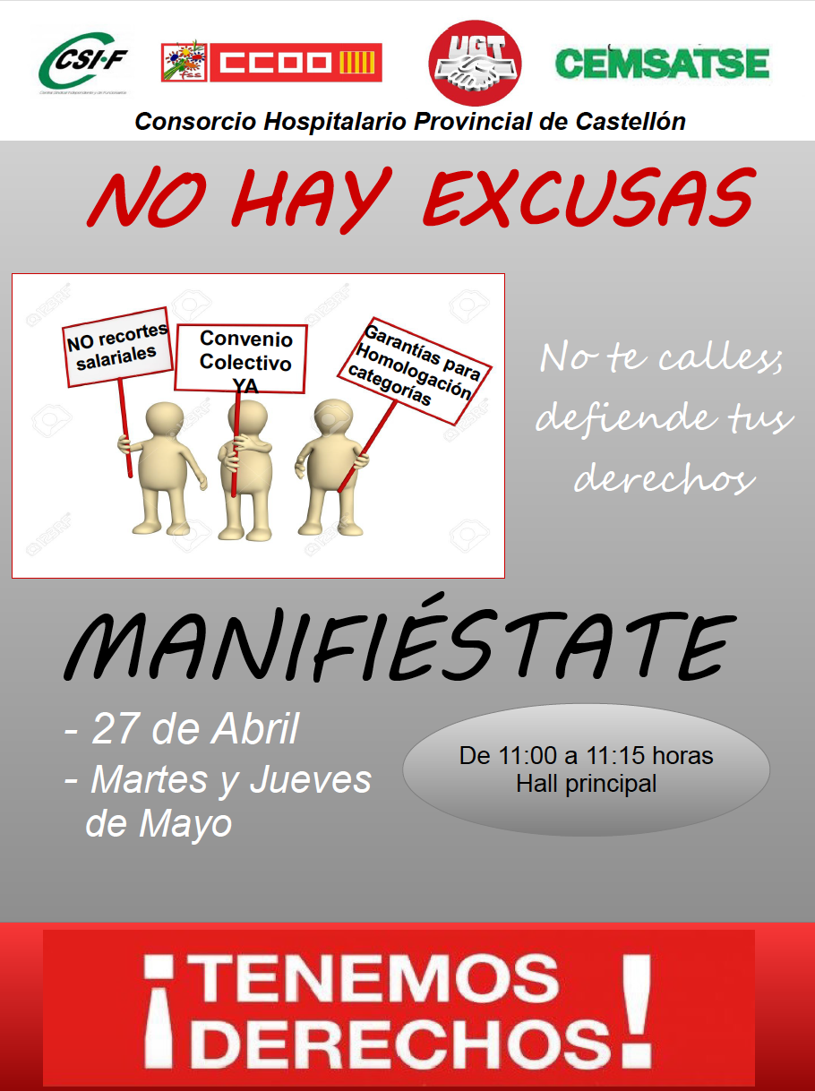 La parte sindical del Consorcio Hospitalario Provincial de Castellón ha remitido el acta de acuerdo, el cual está dirigido a la Gerencia y en concreto al Presidente de la Mesa General de Negociación, Joaquín Sanchís, y en el que se incluyen las reivindicaciones y el calendario de movilizaciones que se anunciaban. A modo general, los sindicatos informan a la de manifestación que tendrá lugar el próximo 27 de abril en el Hall principal del centro y también todos los martes y jueves de mayo. Asimismo, CSI-F, CCOO, UGT y CEMSATSE reivindicarán el cese de los recortes, un convenio colectivo y garantías para la Homologación de Categorías, tal y como consta en el cartel que también han adjuntado.
