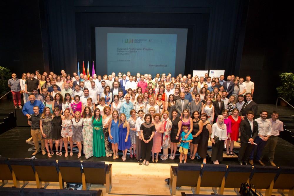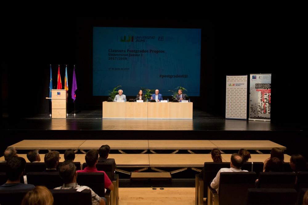 La Universitat Jaume I ha celebrat aquesta vesprada la clausura dels estudis de postgrau propi del curs 2017/2018 en un acte acadèmic que ha estat presidit per Isabel García, vicerectora d'Estudis i Docència; Rafael Benavent, president de la Fundació Universitat Jaume I-Empresa; José Luis Breva, president del Consell Social i Joaquín Beltrán, director Acadèmic d'Estudis