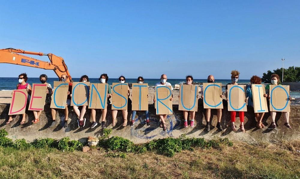L’acció de protesta es va portar a terme a la zona de l’espigó en construcció, al marge esquerre de la desembocadura del Cervol, formant una pancarta de cartró cadascú amb una lletra formant la paraula ‘desconstrucció’.