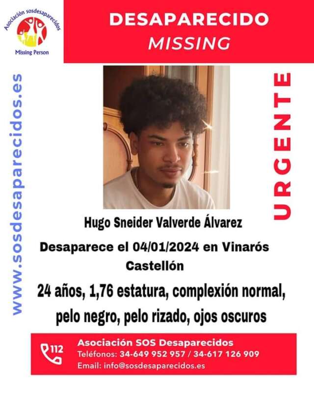 Desaparecido un joven en Vinaròs el pasado 4 de enero según han informado desde la Asociación de Sosdesaparecidos. El joven es Hugo Sneider Valverde Álvarez, tiene 24 años y mide 1,76 centrímetros. Es de complexión normal, pelo rizado y ojos marrones.