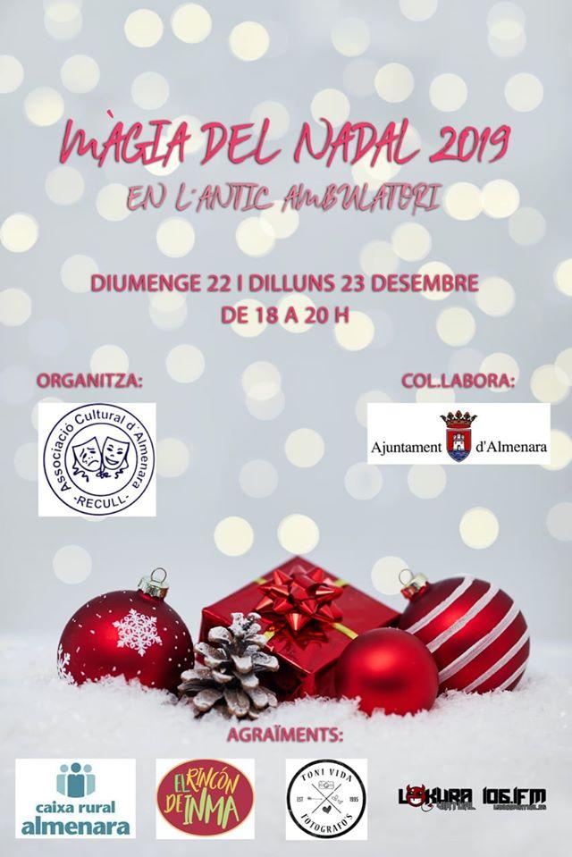 L'antic ambulatori d'Almenara acollirà diumenge que ve i dilluns a la vesprada la segona edició de "la Màgia del Nadal" realitzada per l'Associació Cultural Recull amb la col·laboració de l'Ajuntament d'Almenara. Es tracta de la realització d'un passatge nadalenc per als xiquets i xiquetes (i no tant) que hauran de passar fins a arribar fins al Pare Noel per a entregar les seues cartes. L'antic ambulatori estarà obert de 6 a 8 de la vesprada tots dos dies.