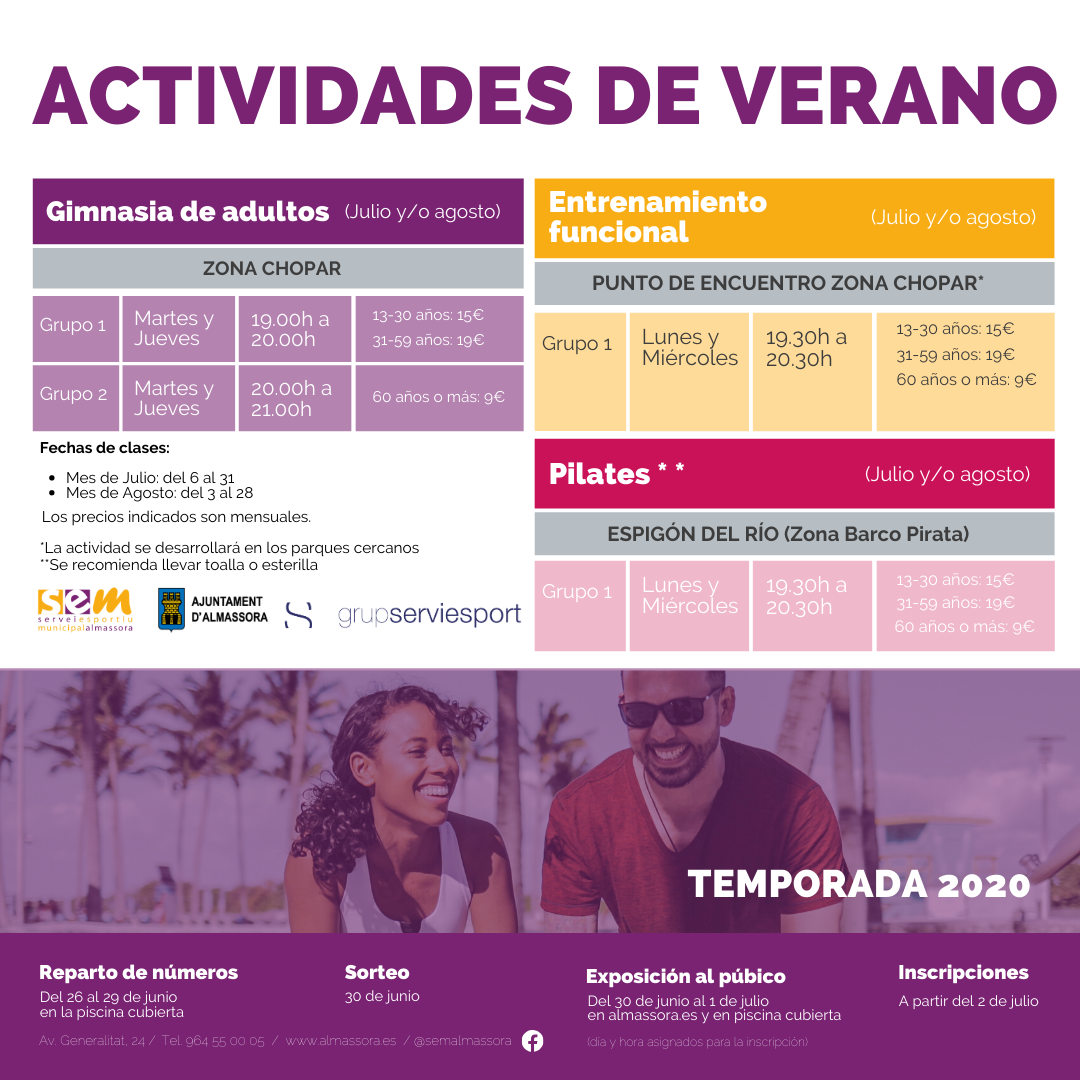 La Regidoria d'Esports ha elaborat una sèrie d'activitats esportives que tindran lloc a la platja d'Almassora durant els mesos de juliol i agost. Les zones del Xopar i de Vora Riu acolliran exercicis com la gimnàstica per a adults, pilates i entrenament funcional. El mes de juliol comptarà amb classes des del dilluns dia 6 fins al divendres dia 31 i el mes d'agost des del dilluns dia 3 fins al divendres dia 28.