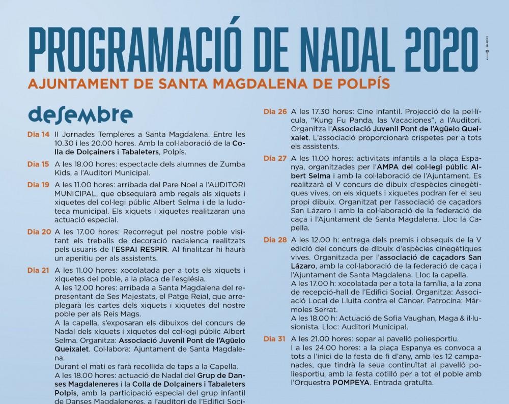 Les regidories de Cultura i Festes de l'Ajuntament de Santa Magdalena ja han donat a conèixer la programació de Nadal, Any Nou i Reis de la localitat, en la qual està previst, que es duguen a terme més de 20 activitats entre el 14 de desembre i el 5 de gener i en les quals destaca la col•laboració de 9 entitats locals.
