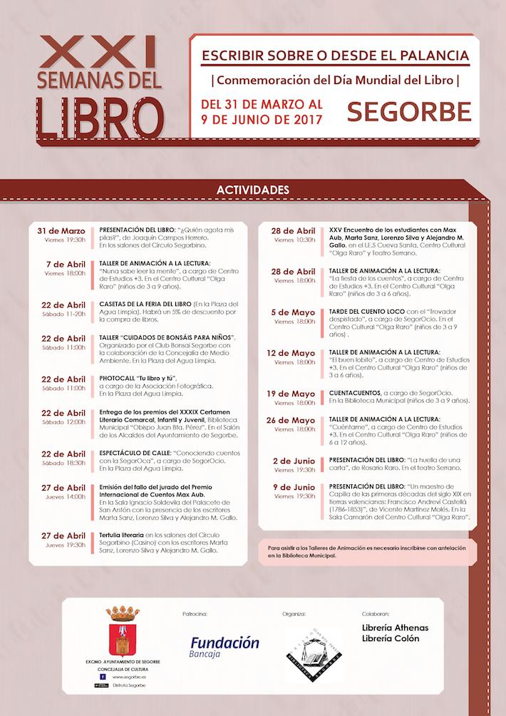 El día más activo de las XXI semanas del libro en Segorbe llega a su cenit el próximo sábado 22 de abril con las tradicionales casetas de la feria del libro en la plaza del Agua Limpia. Durante ese mismo sábado hay programados varios actos entre los que se incluye la entrega de premios del XXXIX Certamen Literario Comarcal Infantil y Juvenil que organiza la Biblioteca municipal.