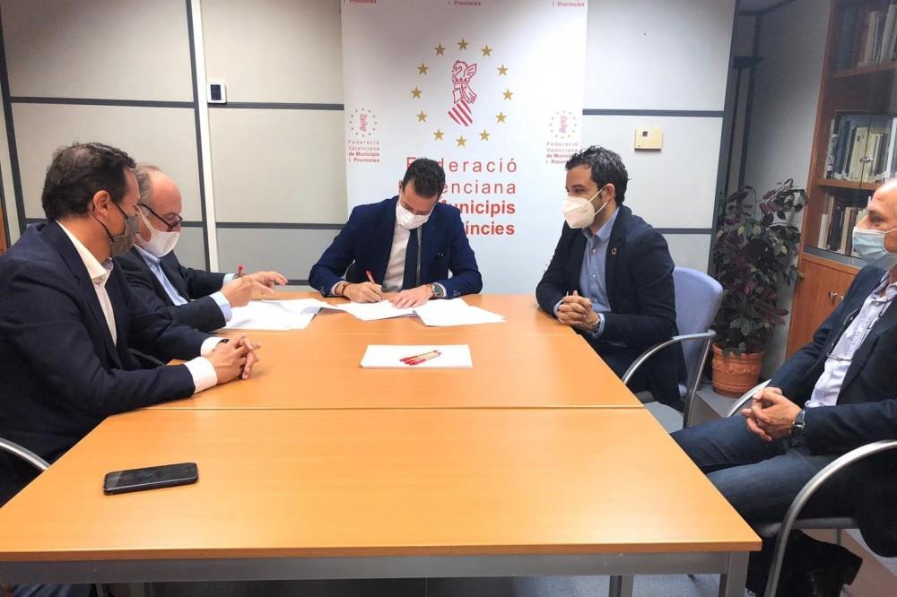 El presidente de la FVMP, Rubén Alfaro y el presidente de FEPEVAL, Santiago Salvador, han firmado un convenio para la promoción, ejecución y prestación de iniciativas y actividades empresariales que contribuyan al desarrollo económico local y a la creación de empleo así como a la conservación y protección del medio ambiente y, en general, a mejorar la calidad de vida de las entidades locales