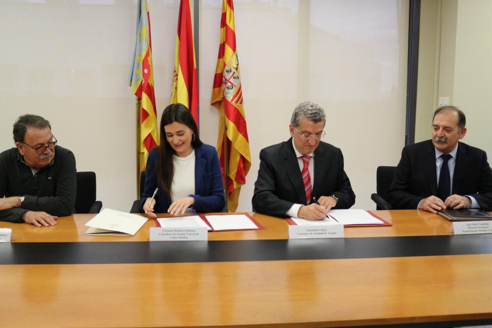 La consellera de Sanitat Universal i Salut Pública, Carmen Montón, y el consejero de Sanidad de Aragón, Sebastián Celaya, han firmado un convenio de colaboración para la atención sanitaria de las zonas limítrofes de ambas comunidades, de modo que los ciudadanos puedan beneficiarse de la asistencia sanitaria integral en los centros más cercanos y accesibles desde su domicilio, con independencia de la comunidad autónoma en la que residan. El convenio beneficiará a más de 11.000 ciudadanos de ambas comunidades.