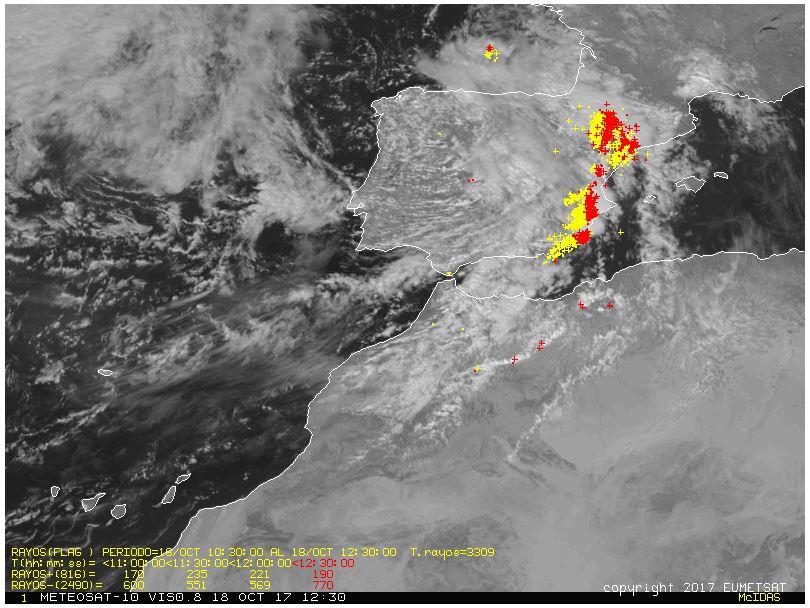 En lo que va de tarde, (hasta las 18.15 horas) se han registrado más de 18000 rayos dándose la mayor concentración en la zona mediterránea.