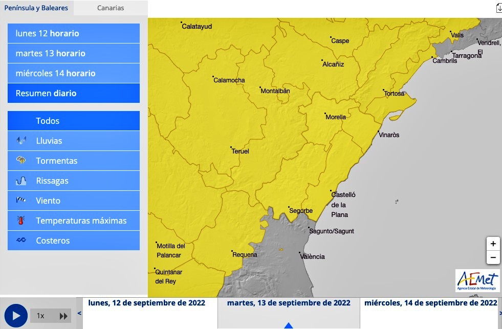 La previsión meteorológica de la Agencia estatal de Meteorología, Aemet, sitúa a la provincia de Castelló en alerta amarilla a partir de las 9 de la mañana.