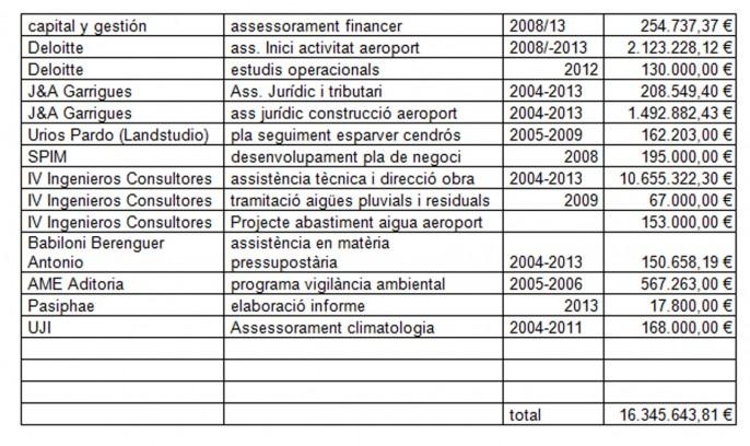 Después de un maratón larguísimo de preguntas y repreguntas parlamentarias, desde el Grupo Parlamentario de Compromís por fin se ha podido saber el coste de los contratos de asesorías externas pagados por Aerocas para el aeropuerto de Castellón. Si bien se sabía el coste total por anteriores respuestas, no se había querido hasta ahora detallar cuánto había costado cada una de estas contrataciones.