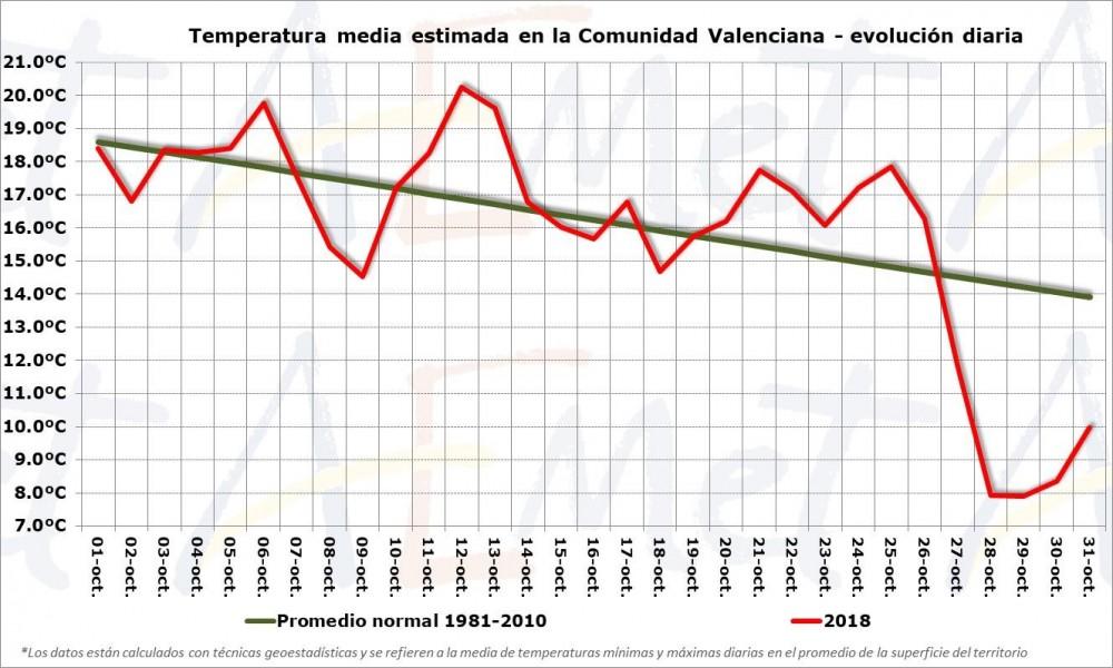 La Agencia estatal de Meteorología ha publicado su informe del mes de octubre en el que destaca que el pasado mes ha resultado frío y muy húmedo en la Comunitat Valenciana. La temperatura media ha sido 15.9ºC, es 0.4ºC más baja que la de la climatología de referencia (16.3ºC), y la precipitación acumulada ha sido 136.2 l/m2, que es casi el doble que la del promedio climático del periodo 1981-2010 (71.0 l/m2). En el resumen se destaca que tras un periodo largo de casi 10 años en los que octubre resultó en general seco o muy seco y cálido o muy cálido (e incluso extremadamente cálido), este pasado mes ha roto la tendencia y ha sido frío y muy húmedo. Dos hitos meteorológicos han marcado el carácter climático del mes: el temporal de lluvias de los días 18 al 20, que le proporcionó el carácter muy húmedo, y la entrada de aire ártico de los últimos días, que determinaron el carácter frío del mismo.