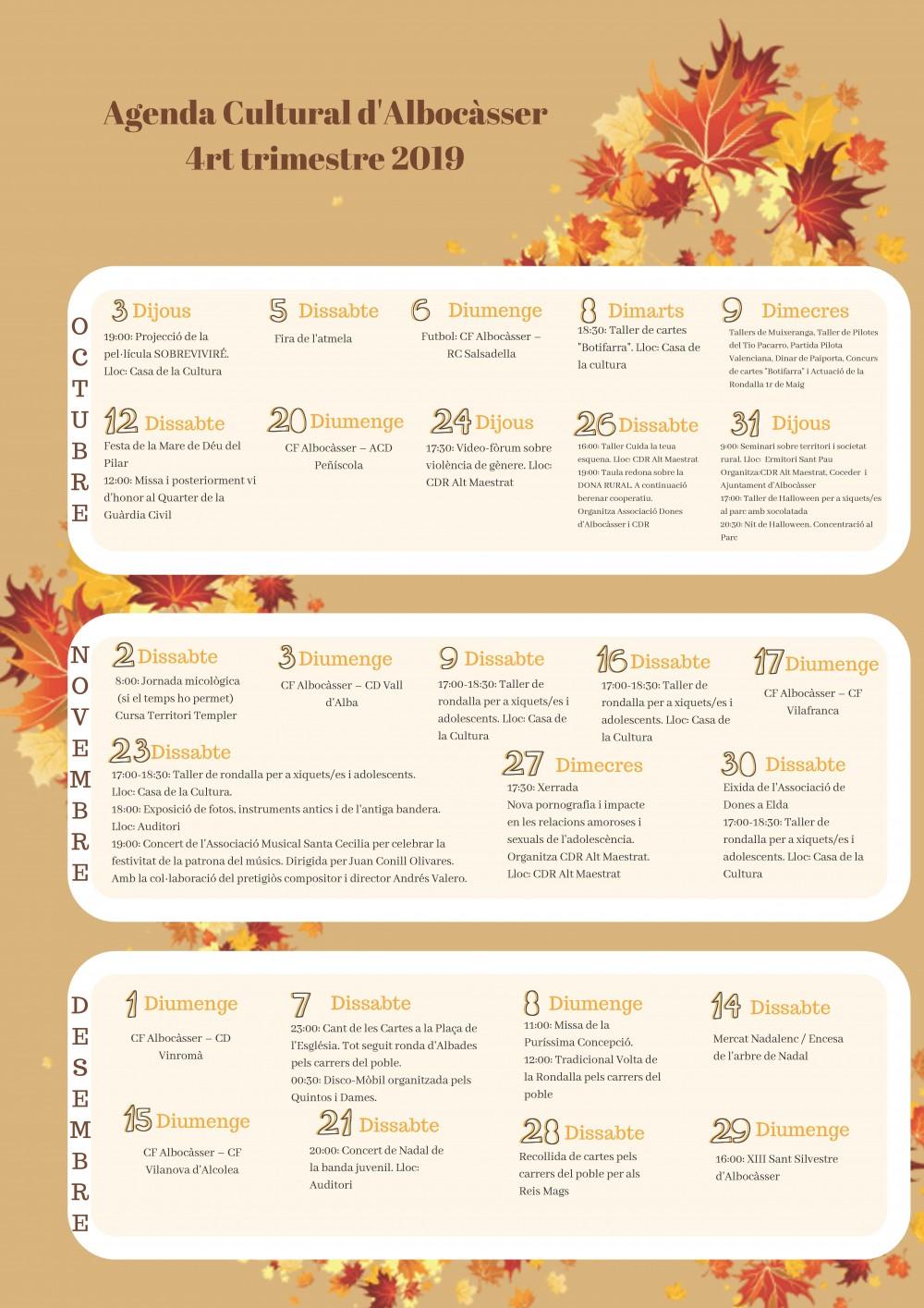 L'Ajuntament d'Albocàsser ha posat en marxa l'agenda cultural de la localitat. Dividida en 4 trimestres, recull, entre d'altres, esdeveniments esportius, tradicionals i musicals.