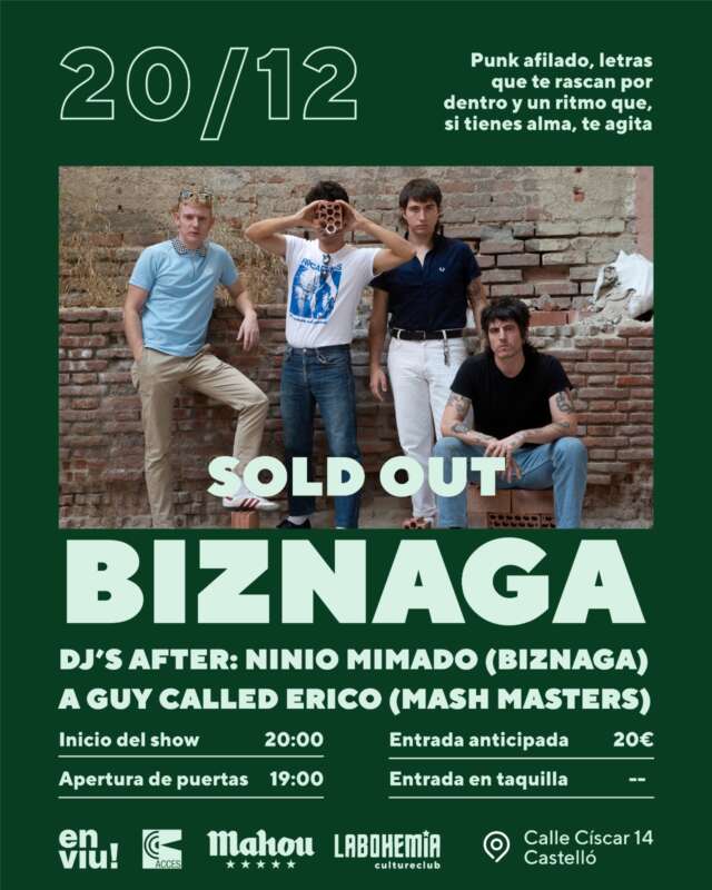 El dissabte 20 de desembre tindrem un dels concerts més esperats de la temporada a La Bohemia: els madrilenys Biznaga. A aquesta cita els acompanyaran els dj's Ninio Mimado (Biznaga) i A Guy Called Erico (Mash Masters) per arredonir i allargar la nit. El concert serà a les 20.00 h. Ja no es poden aconseguir entrades perquè el concert ha colgat el cartell de 'sold out'.