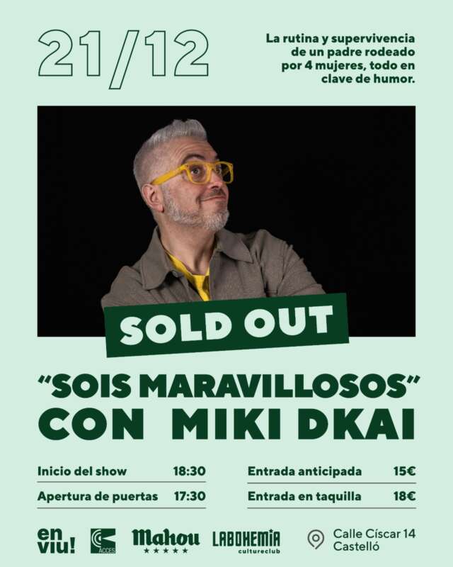 Tanquem la programació setmanal amb el monòleg 'Sois maravillosos' de Miki Dkai el 21 de desembre. Les portes s'obrin a partir de les 17.30 h i es podrà gaudir del monòleg a les 18.30 h. L'espectacle ha fet 'sold out', per la qual cosa ja no hi han entrades disponibles.