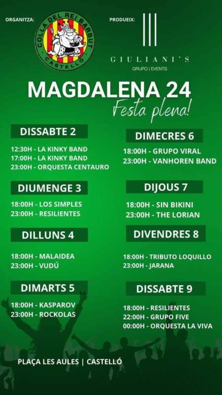 La música se instalará en cada rincón de la ciudad de Castelló con motivo de las fiestas de la Magdalena. Una edición que ya ha iniciado la cuenta atrás para albergar nueve intensos días en los que miles de castellonenses y visitantes se sumarán a una gran diversidad de actos y eventos para impregnarse de la cultura local.