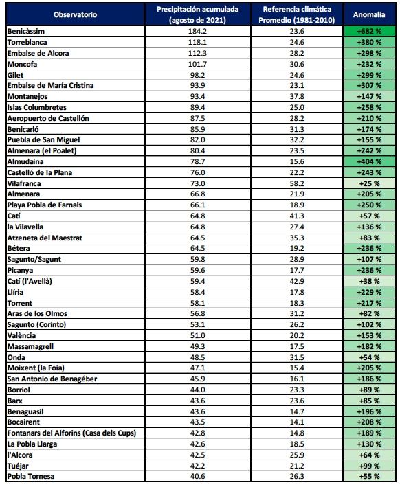 La Agencia Estatal de Meteorología ha valorado el mes de agosto como el más cálido en la Comunitat Valenciana desde 1950, tal como lo demuestra el análisis documental y lo constataron los ciudadanos de la provincia de Castellón. Pero de la misma forma, la provincia de Castellón también vivió uno de sus agostos más húmedos con un porcentaje de precipitación de entre el 60 y 70% de lo que suele ser habitual. Benicàssim batió el récord con un 682% más de lluvia sobre la media habitual.