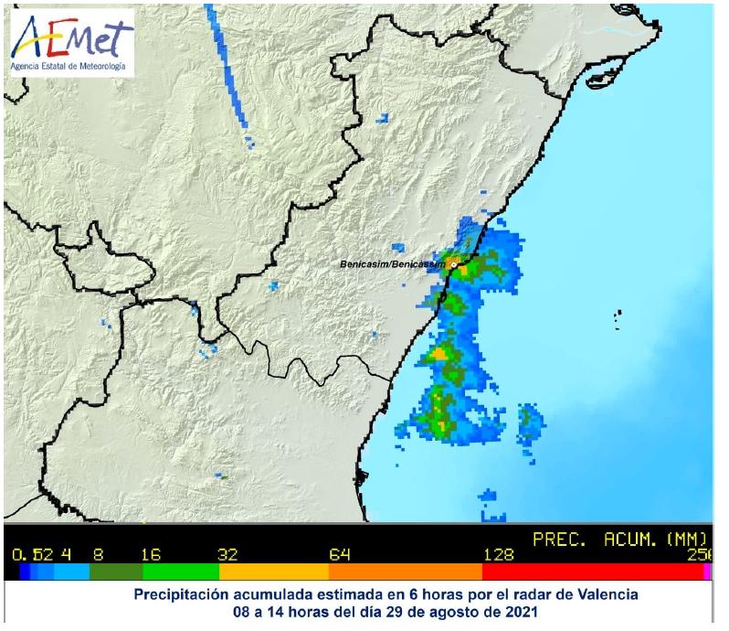 Como se ve en la imagen, que representa la precipitación acumulada en 6 horas estimada por el radar de Valencia, la zona de máximos acumulados en la mañana del día 29 (coloreada en naranja) estuvo muy focalizada en Benicàssim con poca o nula precipitación en el resto de la provincia, aunque luego por la tarde se generalizaron las tormentas nuevamente.