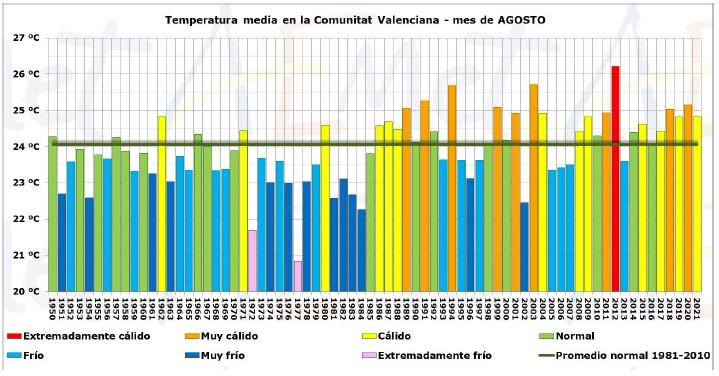El mes de agosto de 2021 ha sido cálido y húmedo en la Comunitat Valenciana. La temperatura media, 24.8 ºC, es 0.7 ºC superior que la de la climatología de referencia (24.1 ºC), y la precipitación acumulada ha sido 34.0 l/m2, que es un 55 % superior que la del promedio climático del periodo 1981-2010 (21.9 l/m2).