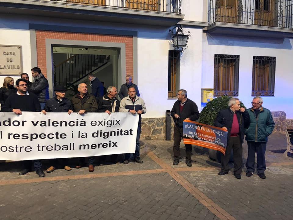 Multitudinaria nueva concentración de los 'llauradors' en varios pueblos de la provincia para defender la agricultura. Esta es la segunda manifestación del sector que reclama al Gobierno y a la Unión Europea que se modifique el acuerdo firmado con Sudáfrica para la importación de cítricos a España y al viejo continente.