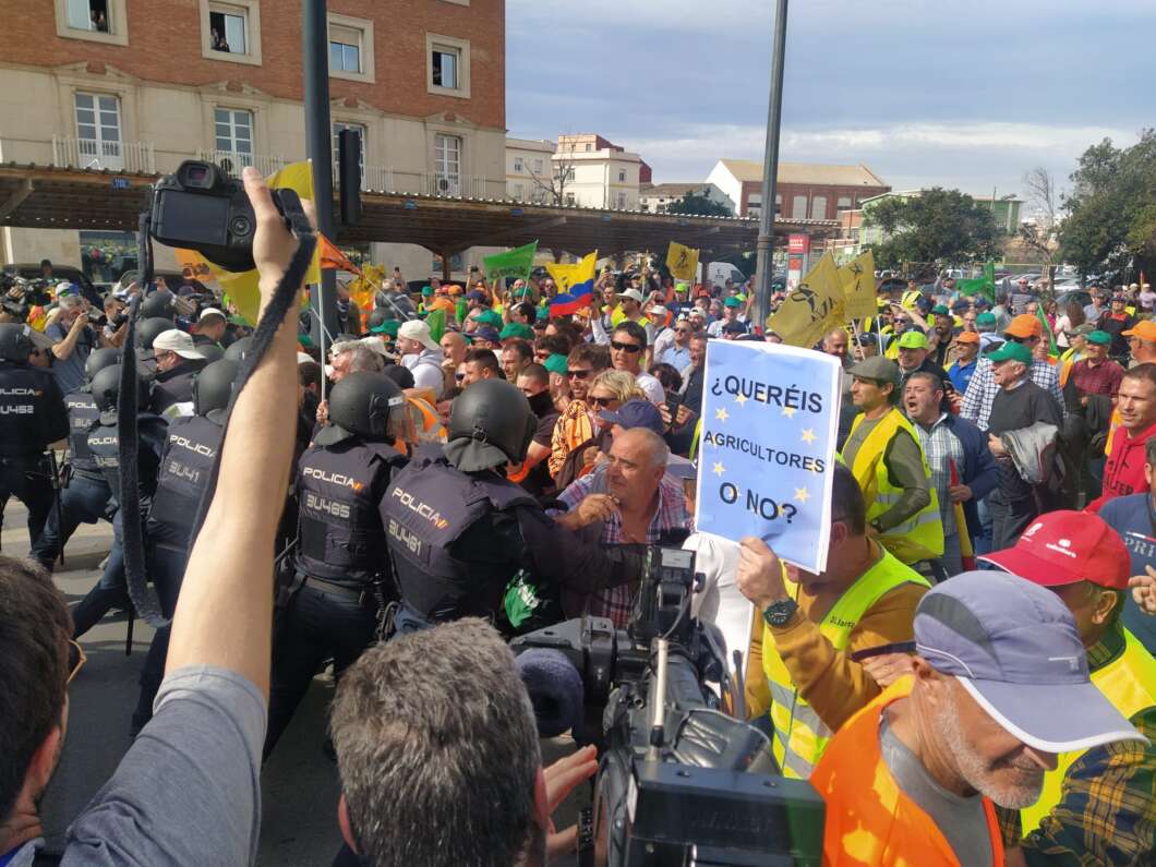 Después de los parlamentos, las entidades quemaron paja creando una cortina de humo y lanzaron al suelo diversos productos agrarios que están sufriendo una insostenible crisis de rentabilidad, tales como naranjas, mandarinas, vino, almendras, cereales, etc. Entre los carteles hubo mensajes que interpelaron a los políticos y los consumidores: “Europa, ¿quieres agricultores o no?”, “Sin agricultores comeremos piedras” o “Cuidamos el bosque verde que no se quema”. Al término de la protesta, algunos manifestantes se dirigieron hacia el puerto con el objetivo de bloquear su acceso, pero la policía les cortó el paso provocando empujones e incluso la detención de un agricultor.