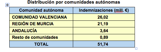 La Comunidad Valenciana y la Región de Murcia, principales zonas productoras, han sido las más afectadas, acumulando más de 90% de las indemnizaciones.