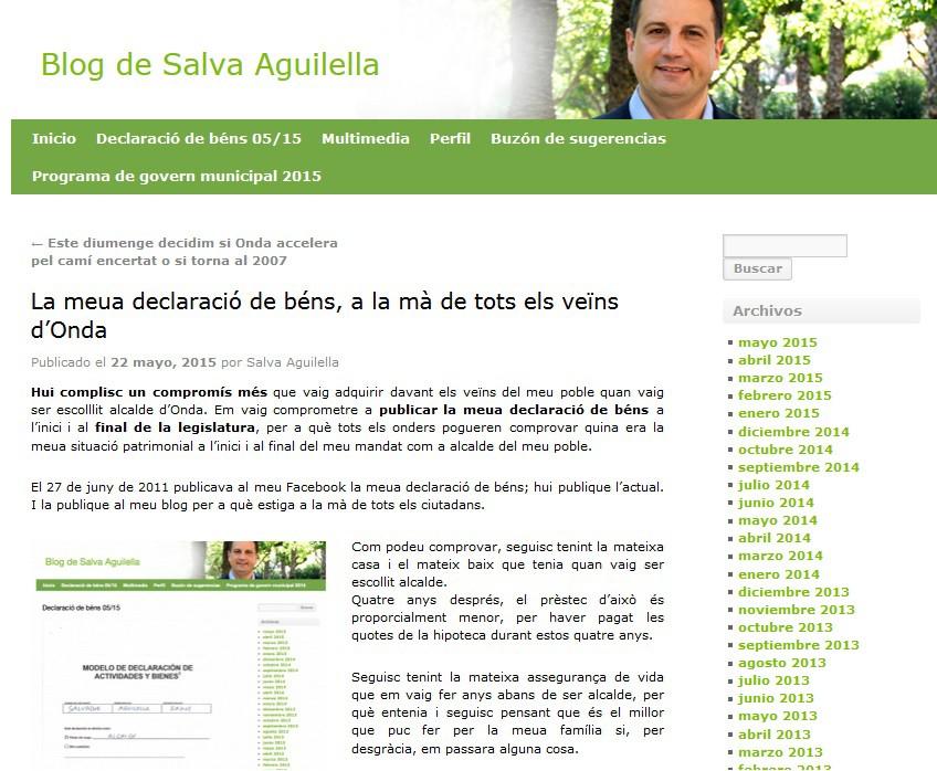 El alcalde de Onda, Salva Aguilella, ha publicado hoy en su blog (http://www.salvaaguilella.es/) su declaración de bienes, tal y como ya hizo en junio de 2011 al asumir la responsabilidad de ser alcalde de la ciudad.