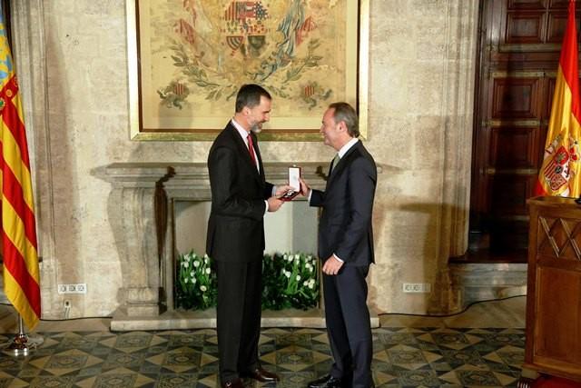 El Presidente de la Generalitat, Alberto Fabra, ha hecho entrega hoy de la Alta Distinción del Gobierno valenciano y de la Gran Cruz de la Orden de Jaume I El Conqueridor a S.M. El Rey Felipe VI. Durante la entrega de los más altos reconocimientos institucionales que se conceden en la Comunitat Valenciana, el President ha trasladado "el profundo cariño que sienten hacia sus majestades los alicantinos, castellonenses y valencianos".