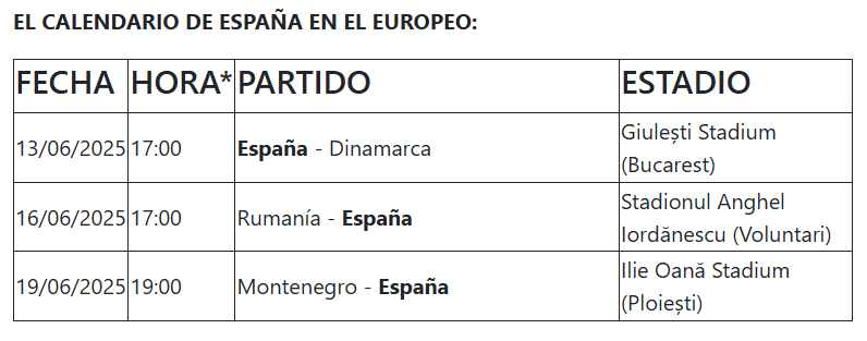 Previamente, España disputará en el Guillermo Amor de Benidorm (el sábado 7 de junio, a las 12 horas) un amistoso contra Estados Unidos (se podrá seguir por RFEF.TV) y ya en el Europeo debutará el 13 de junio contra Dinamarca (17 horas). El 16 se enfrentará a la anfitriona (20 horas) y cerrará la fase de grupos contra Montenegro (19 horas), debutante en la competición. Los dos primeros de cada grupo se clasificarán para semifinales.