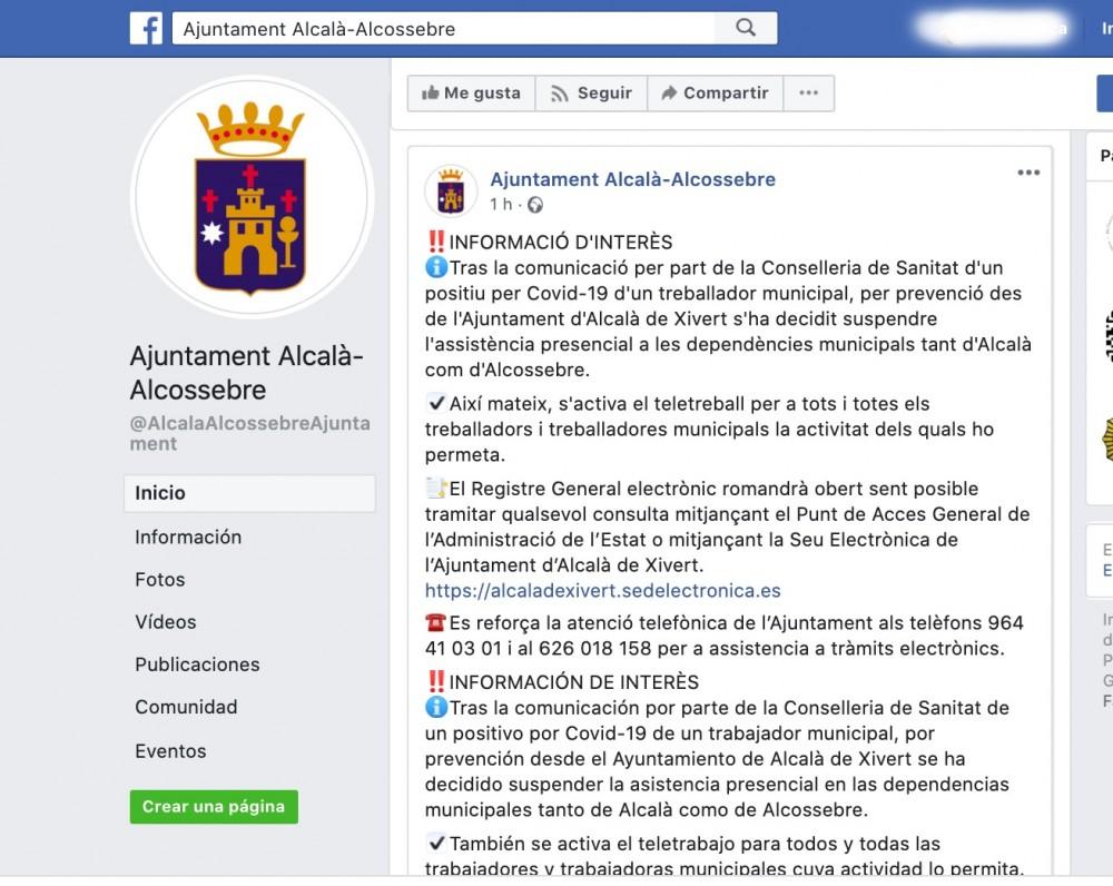 Tal como indica el comunicado:  "Tras la comunicación por parte de la Conselleria de Sanitat de un positivo por Covid-19 de un trabajador municipal, por prevención desde el Ayuntamiento de Alcalà de Xivert se ha decidido suspender la asistencia presencial en las dependencias municipales tanto de Alcalà como de Alcossebre.