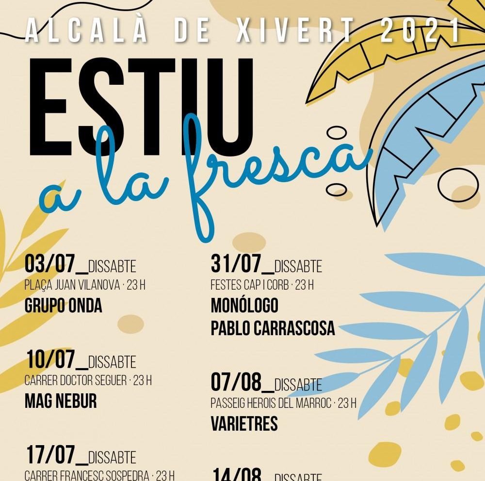“Estiu a la Fresca 2021” comença el 3 de juliol amb l'actuació musical del Grup Onda en la plaça Juan Vilanova. El 10 de juliol, al carrer Doctor Seguer, se celebrarà l'espectacle del Mag Nebur. El 17 de juliol, espectacle musical “Mayte Carreras: de cap a peus” al carrer Francisco Sospedra. El 24 de juliol, en la plaça de l'Església, “La Nit de Boleros amb Sara Canciller”. El 31 de juliol, i dins de les Festes de Capicorb, Manolo Carrascosa. El 7 d'agost, en el passeig Herois del Marroc, espectacle Varietres i el 14 d'agost, al carrer General Cucala, actuació de Pop Ladies.