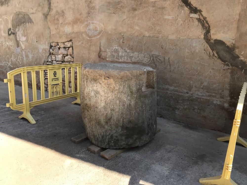 Es tracta d'un contrapés d'una premsa de vi o oli, d'època romana, d'unes dimensions monumentals: 107 cm d'altura, 121 cm de diàmetre i un pes estimat de 3,1 tones.